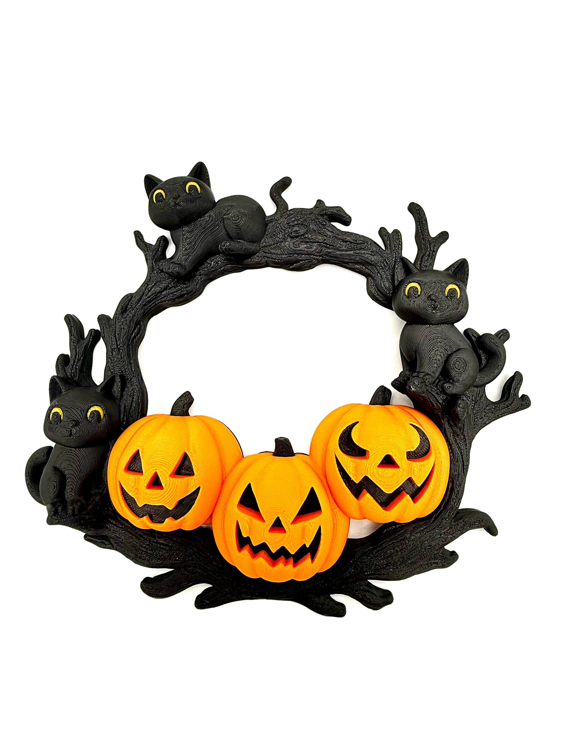 Get ready to spook up your home with our Cat & Pumpkin Halloween Wreath! Decorated with adorable black cats and pumpkins, this wreath is the perfect addition to your Halloween decor. Embrace the playful spirit of the season with this fun wreath. Measuring 7 inches, it's the purr-fect decoration for any cat or Halloween lover. (No witches were harmed in the making of this wreath!)