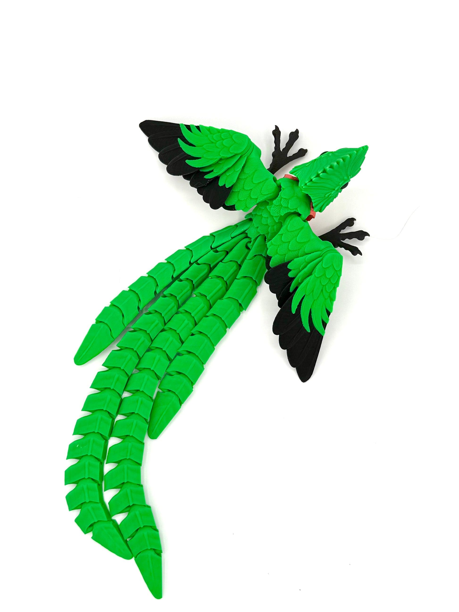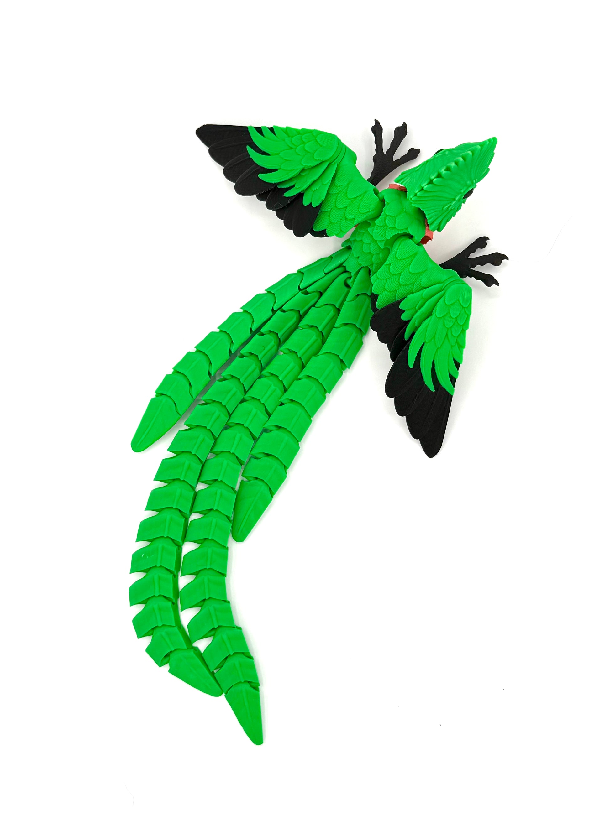The quetzal is vibrantly colored native to Central America's tropical mountain forests, ranging from southern Mexico to Bolivia. This Flexi Quetzal has movement in the head, wings, legs and tail feathers.
