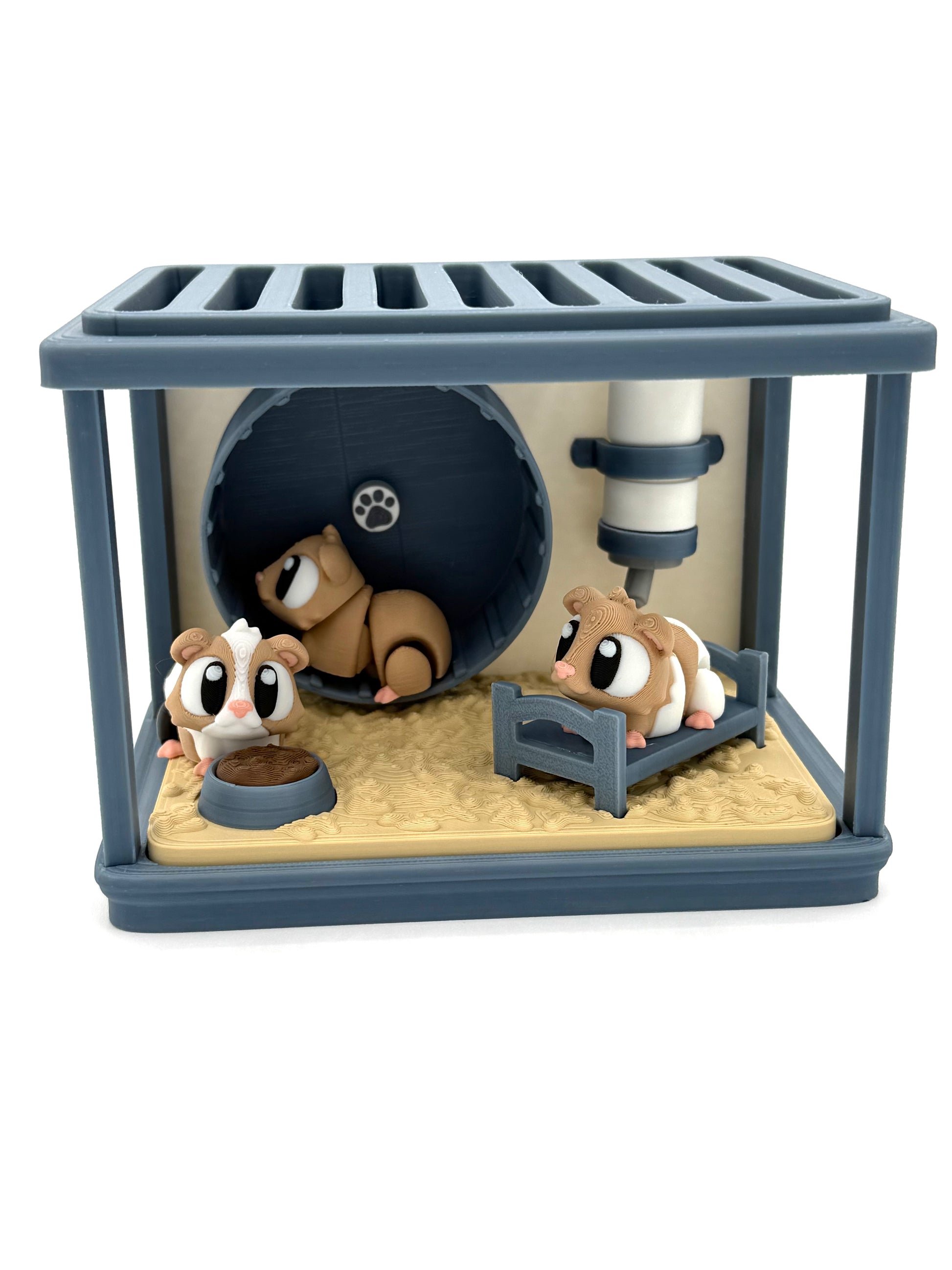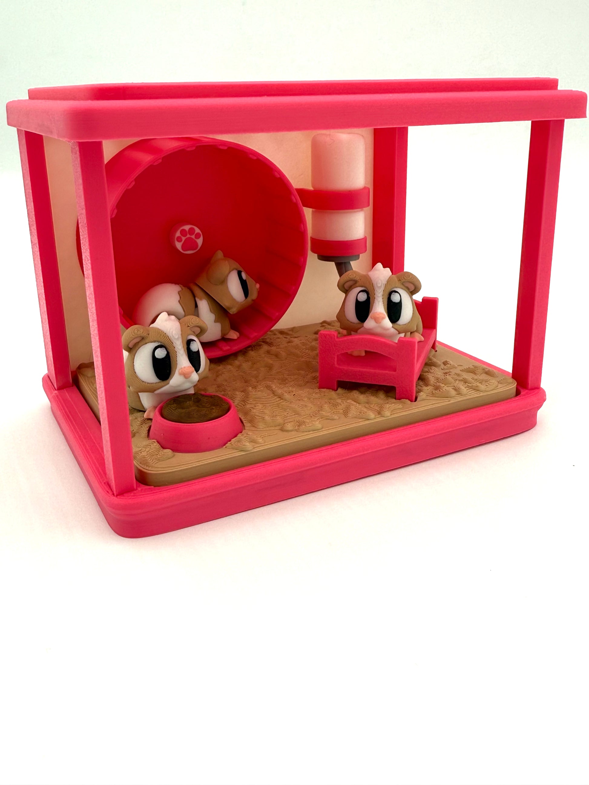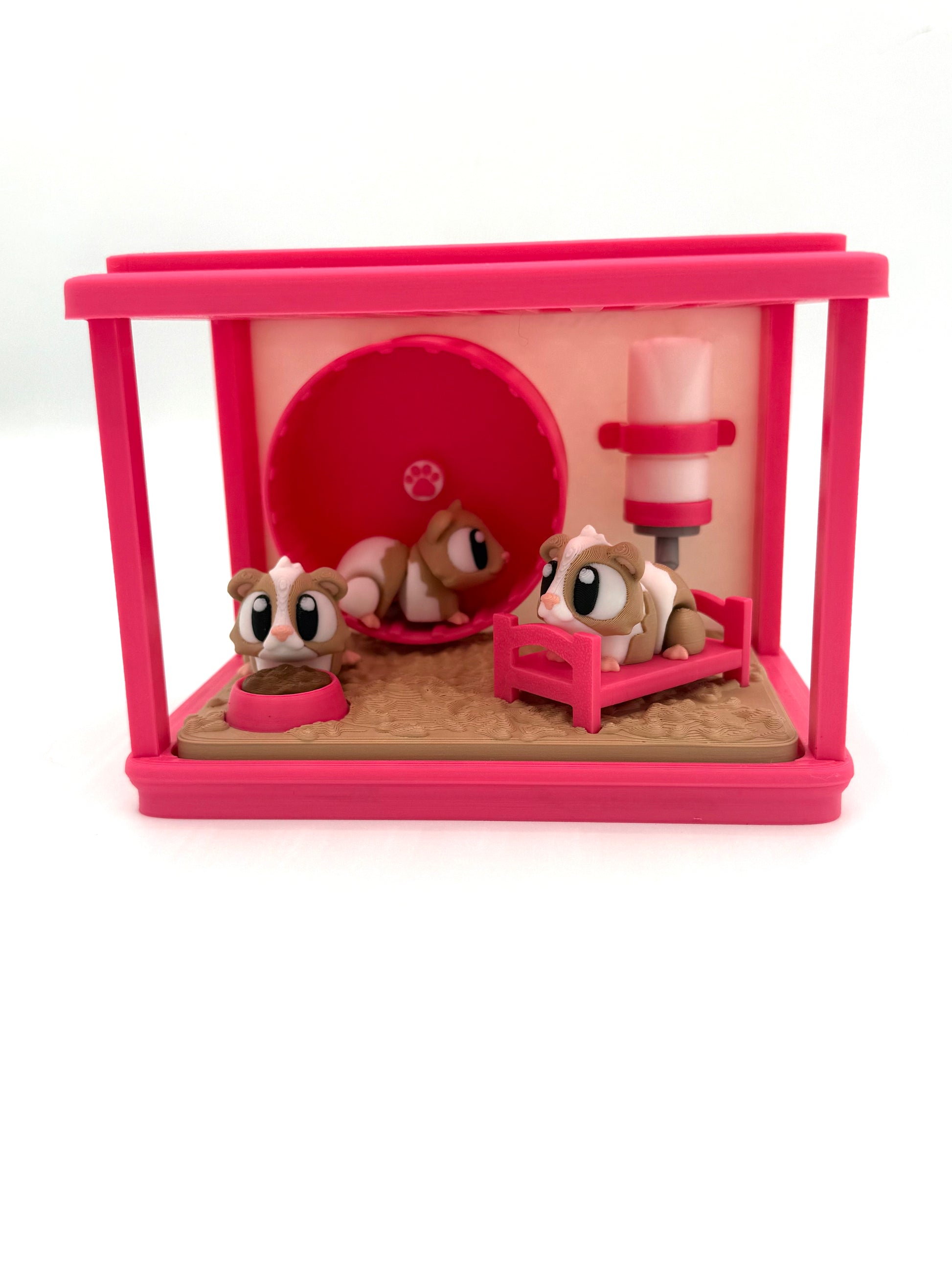 Get ready to snuggle up with this fun and quirky Guinea Pig Cage! Complete with a cozy bed, water bottle, food, and an exercise wheel, this cage comes packed with two adorable guinea pigs. These little guys move like our minis - you'll have a blast playing!
